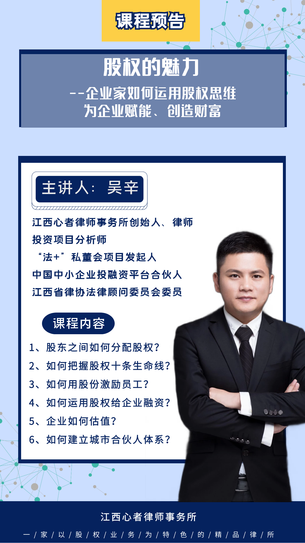 律所主任吳辛開(kāi)始了課程的分享,吳主任引經(jīng)據(jù)典、用眾多現(xiàn)實(shí)的案例為大家分享了股權(quán)的魅力/價(jià)值所在,并分享了眾多干貨知識(shí)告訴大家作為企業(yè)家到底應(yīng)該如何運(yùn)用股權(quán)融人、融資金、融資源,搭班子、組團(tuán)隊(duì),為企業(yè)賦能。